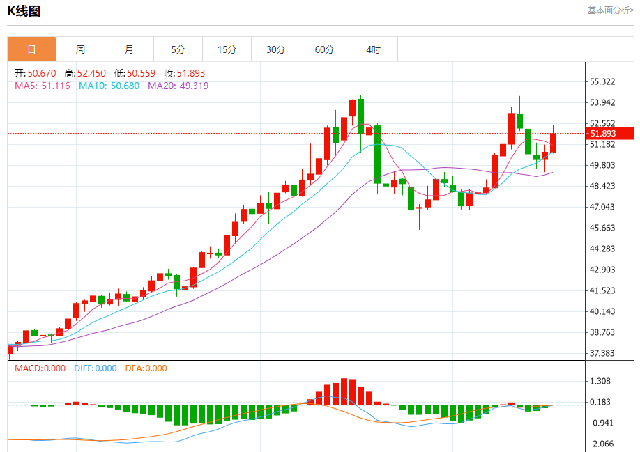 现货白银:截止北京时间21:20,现货白银上涨,现报51.907,涨幅2.43%。纽市盘前,(白银)价格在最后一个盘中交易中强劲上涨,利用了其在EMA50上方交易所代表的动态支撑,超过了52.00美元的阻力,这代表了我们在之前的分析中的预期目标,主要看涨趋势占主导地位,其交易伴随着该趋势短期基础上支持的次要趋势线。