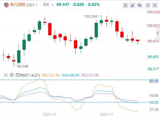 上周五,由于投资者加大美联储在12月降息的押注,而美国假期又使流动性趋于稀缺,截至目前,美元报价99.44。