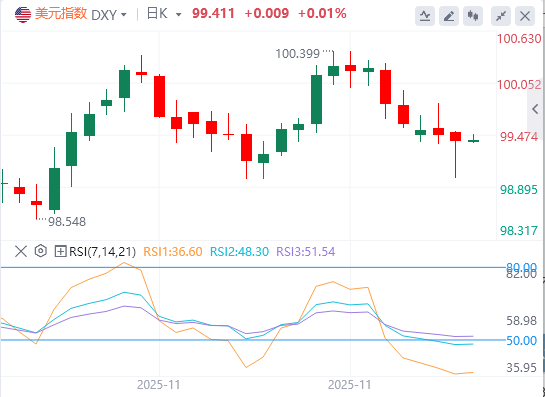周一,美国11月ISM制造业PMI不及预期,美元指数维持弱势,盘中一度逼近99大关,截至目前,美元报价99.41.