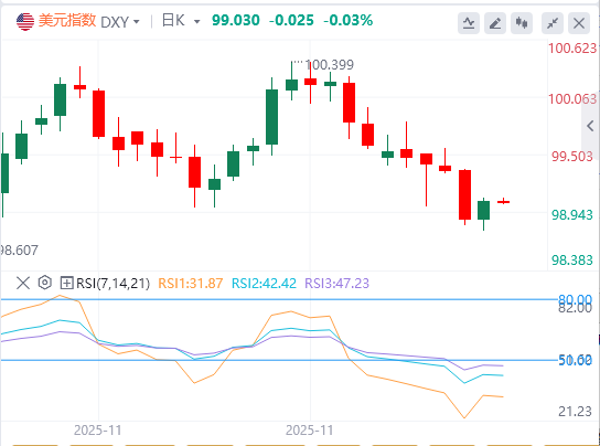 12月5日,北京时间周五亚市早盘,美元指数徘徊在99.03附近。周四,投资者为美联储下周降息做准备,美元指数小幅回升,但仍接近盘中触及的五周低点,最终收涨0.2%,报99.06;基准的10年期美债收益率最终收报4.1030%,对美联储政策利率敏感的2年期美债收益率收报3.5310%。数据显示,美国上周初请失业金人数远低于经济学家预期,降至逾三年来最低水平。现货黄金日内维持震荡走势,最终收涨0.15%,报4208.48美元/盎司;现货白银遭资金获利了结,最终收跌2.33%,报57.11美元/盎司。市场权衡地缘政治紧张局势与沙特下调对亚洲主要原油价格的消息,油价周四在震荡交投中走高。WTI原油最终收涨1.08%,报59.74美元/桶;布伦特原油最终收涨0.91%,报63.32美元/桶。
