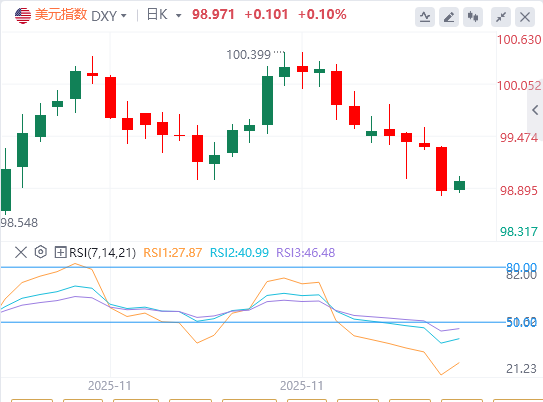周三,美元指数延续跌势,在ADP就业报告显示美国11月就业岗位意外下降后,美元扩大跌幅,截至目前,美元报价98.97。