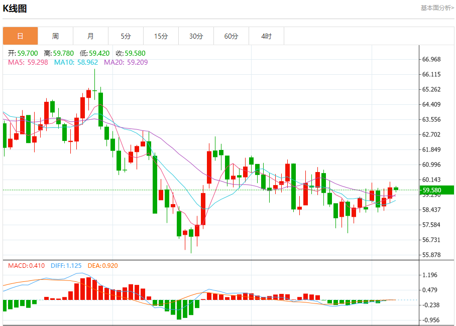 原油市场:截止北京时间21:20,美油下跌,现报59.600,跌幅0.12%。纽市盘前,(原油)价格在最后一个交易日内波动交易,相对强度指标出现负面信号,由于在EMA50上方交易,积极压力持续,短期内沿着小牛市趋势线交易,试图获得看涨势头,这可能有助于其恢复和再次上涨。