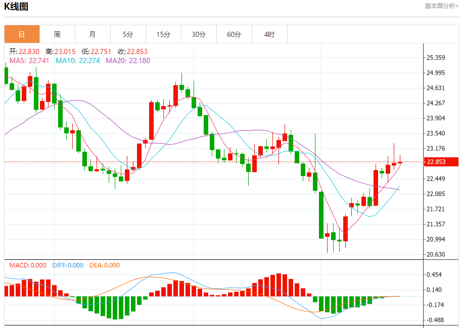 现货白银:截止北京时间20:24,现货白银上涨,现报22.840,涨幅0.07%。纽市盘前,白银价格显示出轻微的看涨倾向,以测试23.00水平,等待突破该水平,以确认今天预期的积极情景的延续,主要目标是23.70水平,注意突破22.75将停止预期的上涨,并推动价格转向下跌。