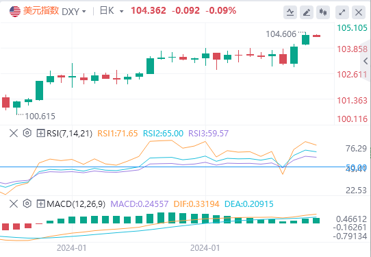 周一,因鲍威尔讲话及美国数据打击降息预期,美元指数进一步走强,刷新去年11月中以来高位,最高达到104.6,最终收涨0.49%,报104.47。美国国债价格延续上周五跌势,十年期美债收益率上涨近14个基点,升至4.16%,截至目前,美元报价104.362。