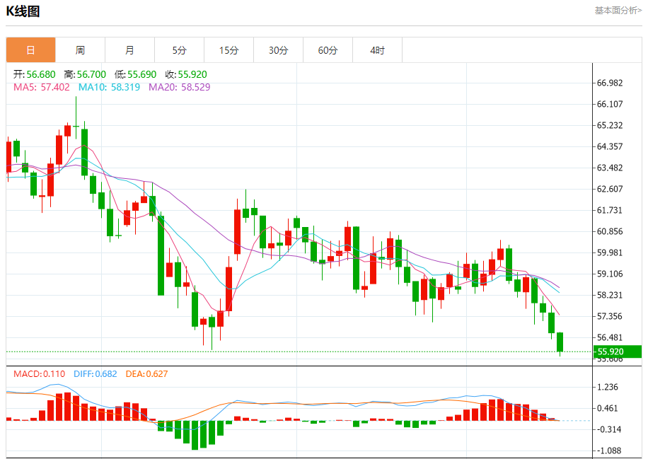 原油市场:截止北京时间21:20,美油下跌,现报55.920,跌幅1.57%。纽市盘前,(原油)价格在最近的盘中交易中出现大幅下跌,跌破了关键支撑位56.40美元,随后触及了下一个支撑位55.65美元,这代表了我们的最后潜在目标。由于其交易价格低于EMA50,负面压力持续,这强化了短期内陡峭的小幅空头波动的强度,尤其是在其沿趋势线交易时。