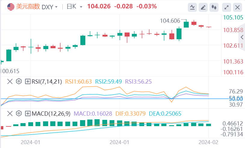 美元/日元在今日央行官员讲话后上涨,中国CPI同比下降(再次出现通货紧缩为-0.8%) 这是自全球金融危机以来最快的速度。截至目前,美元报价104.026。