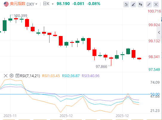 美元指数:截至发稿,美元徘徊在98.19附近。美联储(Fed)最近连续第三次降息削弱了美元(USD)的支撑,导致美元在本周假期提前关闭的市场中普遍走低。技术面上,价格走势继续遵循整体下跌趋势,反弹在50日均线附近及99.20–99.30附近上通道边界受限。