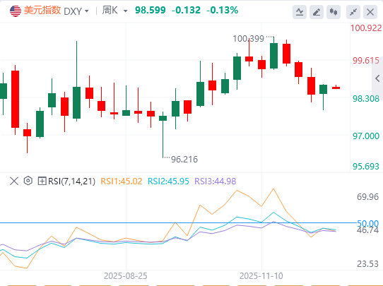 上周五,美元指数震荡上行,盘中一度逼近99关口,截至目前,黄金报价98.59。