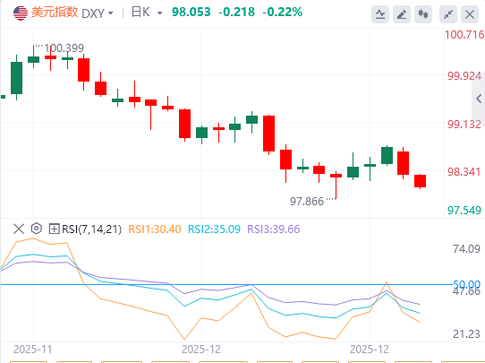 周一,美元指数开盘后持续下行,盘中一度跌至98.19的日内低点,截至目前,美元报价98.05
