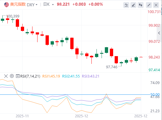 美元指数:截至发稿,美元徘徊在98.22附近继上周大幅下跌后,美元已进入盘整阶段。美元走弱的节奏明显放缓,与此同时,正值节假日期间,市场参与度低迷,交易活动持续清淡。在流动性不足的背景下,市场情绪趋于谨慎:投资者不愿开立新头寸,主要货币对的价格走势愈发受短期资金流动和区域性因素驱动,而非可持续的基本面趋势主导。技术面上,,美元指数面前站住五日线,但除去5日线以外均线均呈现空头走势,后续需要观察98关键价位的情况,如果美元指数能站稳98,则有望开启反弹。