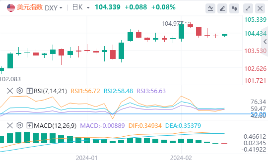 美元指数:截止发稿,美元指数交投于104.339附近。在整体和核心PPI上升的情况下,美元指数可能会进一步上行,因为1月份的火热通胀数据可能导致美联储保持谨慎立场。本周的焦点将集中在联邦公开市场委员会(FOMC)的会议纪要上,美联储(Fed)的几位官员将在未来几个交易日进行讨论。技术面上,根据日线图,RSI在正值区域内表现为平坦。这意味着市场的购买势头正在放缓,买卖力量之间正在实现平衡。然而,这种平坦的位置也可能意味着多头在强劲上涨后正在喘口气。MACD 直方图显示绿色条线递减。这表明看涨力量正在失去动力,空头可能很快就会占据上风。虽然看涨势头正在放缓,但这并不说明全面的看跌收购,而是看跌倾向疲软。