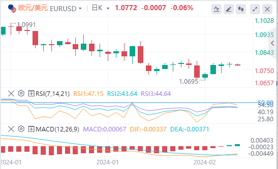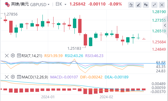 英镑:截止发稿,英镑/美元徘徊于1.2584附近。英镑/美元周一持平,收报1.2594。本周剩余时间里,周四,英国和美国的2月份制造业和服务业采购经理人指数初值调查将为市场带来新的动力。周三,美联储将公布1月份政策会议纪要。目前,市场正在推迟美联储和英国央行启动宽松周期的时间,因为这两个机构都没有得到足够的证据表明通胀压力正在下降。一方面,美联储的会议纪要可能会向市场明确显示美联储官员对启动降息货币政策持开放程度,而英国和美国采购经理人指数(PMI)将提供有关两国经济健康状况的更多信息。这两份报告可能会加剧英镑/美元波动,因为这可能会影响美联储和英国央行启动降息周期的押注和时点。技术面上,英镑/美元货币对显示出的情况是,相对强弱指标(RSI)目前处于负值区域。日线相对强弱指标显示,近期的动能主要由卖方推动,MACD指标红色柱状持续,也表明英镑/美元动能为看跌。