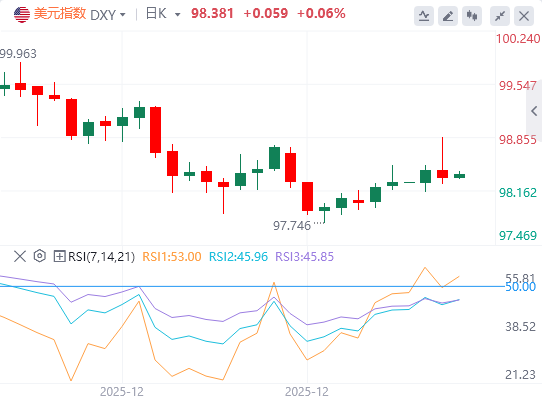 美元指数:截至发稿,美元徘徊在98.38附近。美元兑主要货币在12月下跌,但在圣诞节前后真正触底,在周五就业数据公布之前,美元将出现上行修正,本周及下周的通胀、工业生产和零售销售等数据,或将强化美国经济未进一步恶化、美联储在第一季度将按兵不动的观点。技术面上,眼下正测试98.74一线阻力——该位置同时也是前期的关键支撑位。上方来看,99.00关口的200期指数平均线(200-SMA)是重要阻力位;下方支撑则位于98.12和97.90。当前相对强弱指标(RSI)读数为69,释放出积极的动能信号。