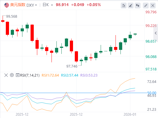 1月9日,北京时间周五亚市早盘,美元指数徘徊在98.91附近。周四,美元指数连涨三日,盘中逼近99关口,最终收涨0.125%,报98.87;美债收益率普涨,基准的10年期美债收益率最终收报4.173%,对美联储政策利率敏感的2年期美债收益率收报3.498%。现货黄金先跌后涨,收复了早些时候的失地,最终收涨0.47%,报4477.42美元/盎司;由于投资者正准备迎接未来几天内价值数十亿美元的期货合约抛售潮,现货白银连续第二个交易日走低,一度下破74美元关口,最终收跌3.76%,报78.19美元/盎司。随着全球多个主要产油国陷入地缘政治危机,引发供应中断担忧,国际原油反弹。WTI原油美盘加速拉升,最终收涨3.61%,报58.33美元/桶,创两周高位;布伦特原油最终收涨3.79%,报62.49美元/桶。