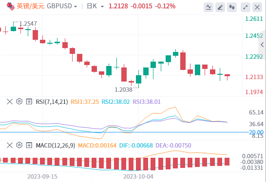 英国国家统计局周五报告称,英国9月零售销售月率下降了0.9%。前值成长0.4%,低於市场预期的下降0.1%。同时,英国央行行长安德鲁贝利(AndrewBailey)周五在接受《贝尔法斯特电讯报》采访时表示,他预计下个月通膨率将"明显下降"。英镑/美元在欧市早盘承受了看跌压力,目前在1.2100附近的负区域交投。
