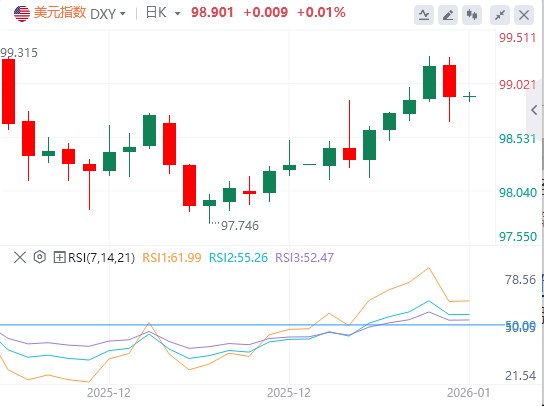 美元指数:截至发稿,美元徘徊在98.90附近。美联储主席鲍威尔因华盛顿总部装修项目是否误导国会而受到联邦检察官调查引发市场对美元走势的不确定性。地缘政治风险继续为美元提供避险支撑。特朗普总统警告伊朗若对使用武力,将面临美国可能采取的行动;伊朗方面则警告美以不得干预。与此同时,英国和德国等欧洲国家考虑在格陵兰增加军事存在,以强化北极安全。这些因素在短期内增加美元避险需求,并对美元走势形成支撑。技术面上,如果美元指数回落至50日均线98.59以下,将朝最近的支撑位移动,该支撑位位于98.00至98.15区间。
