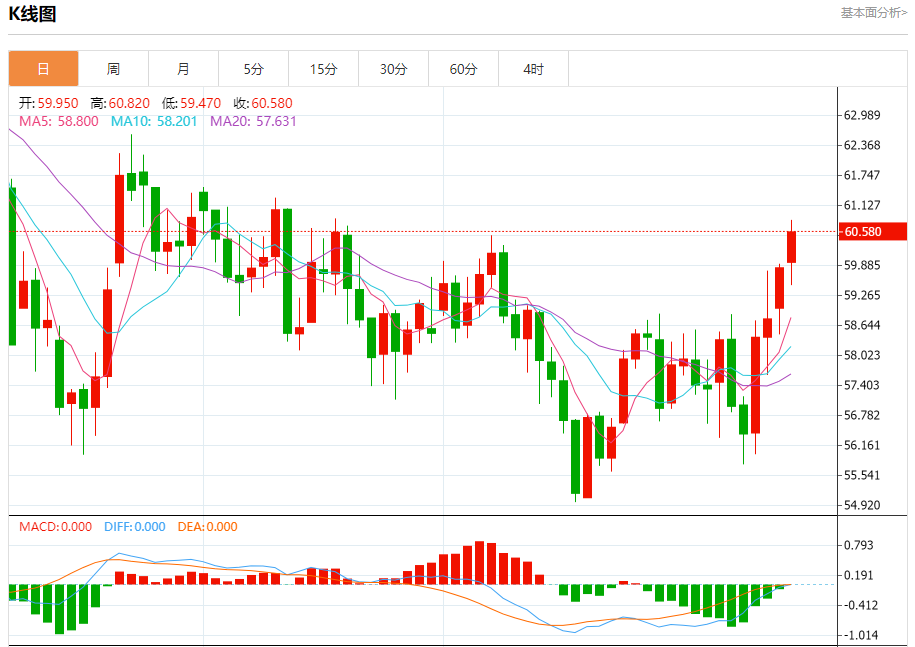 原油市场:截止北京时间21:20,美油上涨,现报60.560,涨幅1.78%。纽市盘前,(原油)价格在最近一次交易中在盘中水平上升,达到60.00美元的阻力位,这代表了我们在之前的分析中的预期目标,受到短期强劲牛市优势的支持,其在EMA50上方交易所代表的动态压力仍在继续,另一方面,我们注意到相对强度指标在达到超买水平后开始出现负面重叠信号,这可能会减少即将到来的收益。