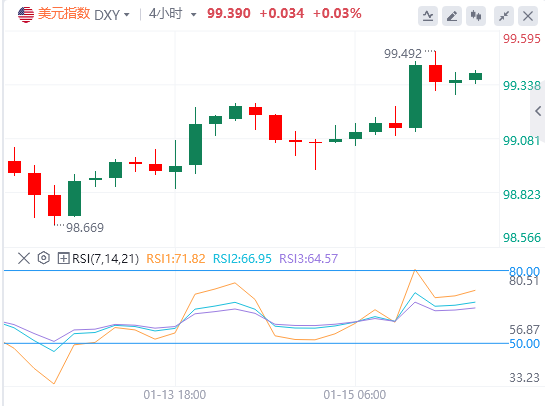 1月16日,北京时间周五亚市早盘,美元指数徘徊在99.39附近。周四,初请失业金人数意外下降,这增强了美联储将在数月内按兵不动的预期,美元指数延续日内强势,最终收涨0.3%,报99.35;基准的10年期美债收益率最终收报4.1780%,对美联储政策利率敏感的2年期美债收益率收报3.5750%。内塔尼亚胡密电特朗普,劝阻美国对伊动武,这进一步打压了黄金的避险需求,现货黄金震荡下行,最终收跌0.24%,报4615.34美元/盎司;现货白银最终收跌0.82%,报92.42美元/盎司。因特朗普可能避免打击伊朗,中断了国际油价的连续涨势。WTI原油最终收跌3.08%,报59.16美元/桶;布伦特原油最终收跌2.48%,报63.76美元/桶。