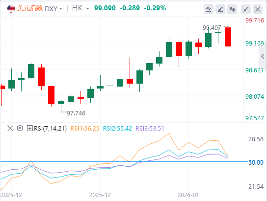 1月19日,北京时间周一亚市早盘,美元指数徘徊在99.09附近。上周五,特朗普表示希望让哈塞特继续留任原职位,市场猜测哈塞特出任美联储主席的机会降低,美元指数扭转跌势,最终收涨0.02%,报99.38点;基准的10年期美债收益率最终收报4.227%,对美联储政策利率敏感的2年期美债收益率收报3.592%。投资者在近期金价创下新高后获利了结,同时地缘政治紧张局势缓和的迹象进一步削弱了黄金的避险吸引力,现货黄金最终收跌0.43%,报4595.03美元/盎司;现货白银最终收跌2.3%,报90.08美元/盎司。尽管美国打击伊朗的可能性已经下滑,但伊朗潜在的政治风险仍未消除。WTI原油最终收涨0.12%,报59.23美元/桶;布伦特原油最终收涨0.52%,报64.21美元/桶。
