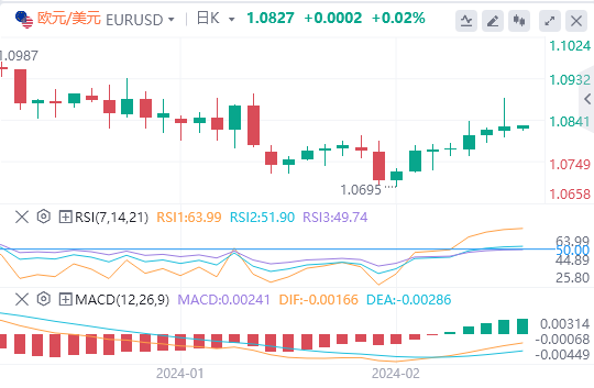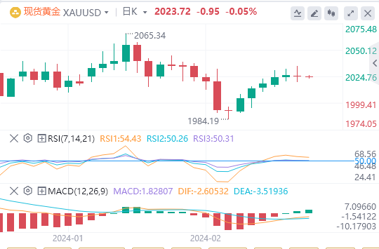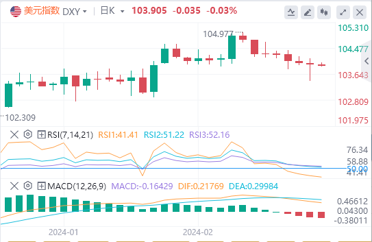 2月23日,北京时间周五亚市早盘,美元指数徘徊在103.905附近。周四,美元指数上演深V反转,盘中最低触及103.432,但在美国经济数据坚挺以及美联储官员为近期降息的预期泼冷水后持续反弹,一度站上104关口,接近收复日内全部跌幅,最终收跌0.046%,报103.94。美债收益率继续收高,基准10年期美债收益率收报4.327%,对美联储政策利率最敏感的2年期美债收益率收报4.72%,创去年12月美联储政策会议以来新高。受美元先涨后跌的影响,现货黄金呈现倒V形走势,最终收跌0.08%,报2024.4美元/盎司,止步日线五连阳;现货白银进一步远离23关口,最终收跌0.61%,报22.75美元/盎司,再创一周新低。由于美国原油库存增幅低于预期,加剧了现货市场收紧的迹象,国际油价升至近期交易区间顶部附近。WTI原油收涨0.4%,报78.29美元/桶;布伦特原油收涨0.36%,报83.36美元/桶。天然气方面,美国天然气期货日内一度大跌6%;欧洲基准天然气期货一度跌至每兆瓦时22.98欧元,为自2021年5月以来最低水平。