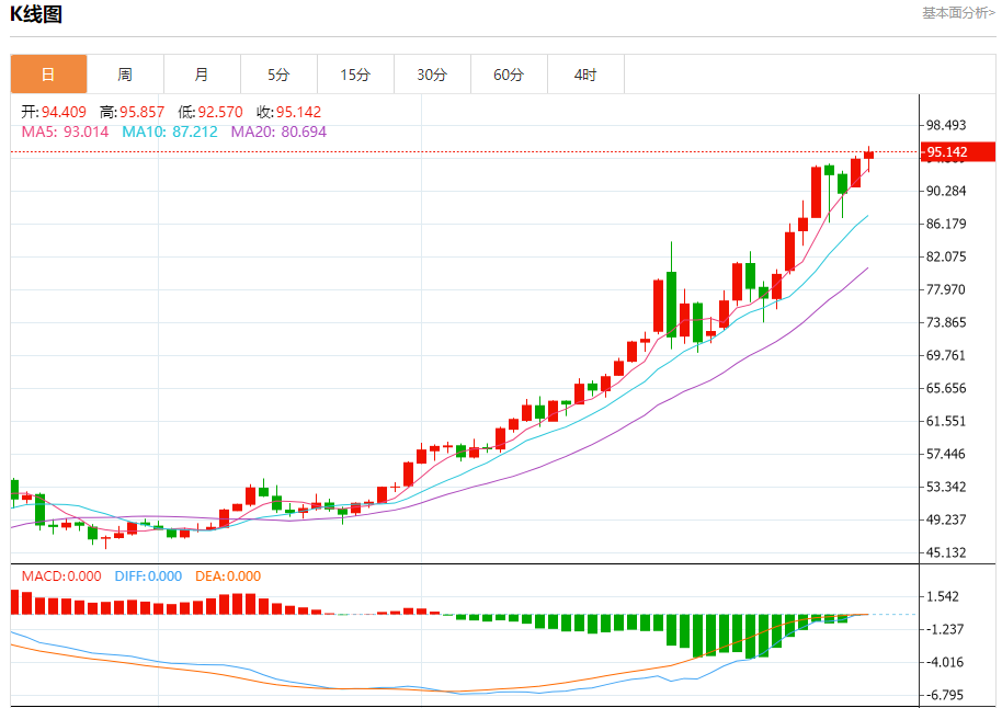 现货白银:截止北京时间21:20,现货白银上涨,现报95.176,涨幅0.90%。纽市盘前,(白银)价格在其最后一个交易日小幅上涨,创下新的历史水平,利用了其在EMA50上方交易所代表的动态支撑,并在短期主要看涨趋势的主导下,其交易沿着趋势线进行,加强了看涨势头,尽管相对强度指标出现了负面信号,但在达到超买水平后,试图摆脱这种超买条件,减少了最后的收益。