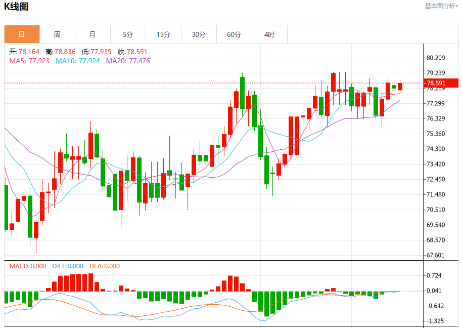 原油市场:截止北京时间21:20,美油上涨,现报78.575,涨幅0.36%。纽市盘前,原油价格现在正在测试关键支撑位78.25,正如我们今天早上提到的那样,价格需要保持在这一水平以上才能保持今天的看涨趋势,因为突破这一水平将使价格承受下一个主要目标达到77.00的负面压力。