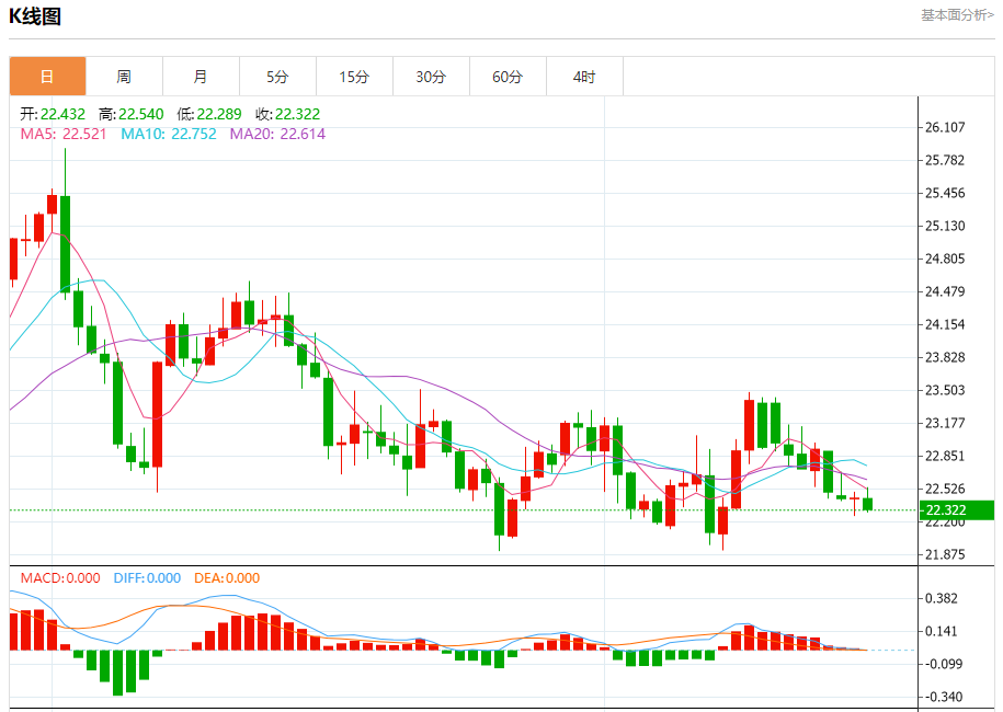 现货白银:截止北京时间21:20,现货白银下跌,现报22.323,跌幅0.49%。纽市盘前,白银价格在22.50水平附近波动,受随机利空影响,该利空阻碍了白银继续上涨,等待有助于推动价格恢复牛市的积极动机,主要目标是22.70,其次是23.00水平。
