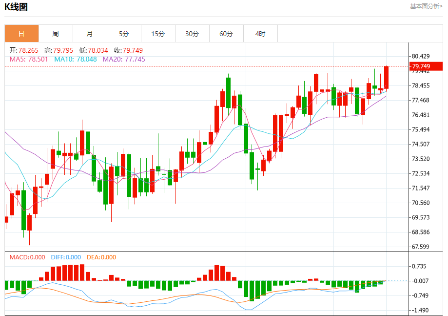 原油市场:截止北京时间21:20,美油上涨,现报79.789,涨幅1.94%。纽市盘前,原油价格倚靠78.25水平并强劲反弹至突破78.75,并确认开启了今天继续上涨的道路,并为实现我们在80.00的下一个目标开辟了道路,注意到超过这一水平将推动价格向81.55迈进,作为下一个积极的站。