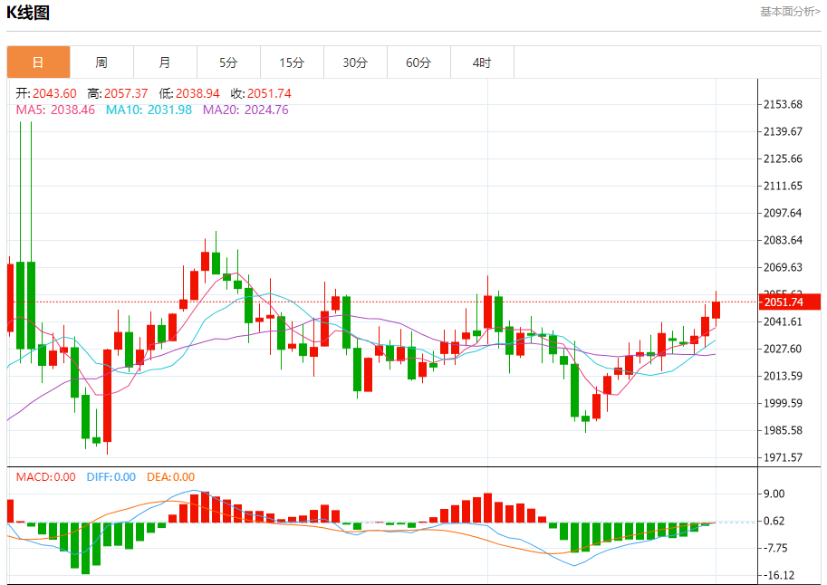 现货黄金:截止北京时间21:20,现货黄金上涨,现报2051.56,涨幅0.35%。纽市盘前,黄金价格重新测试了反向头肩顶形态的突破颈线并从那里向上反弹,价格需要在2040.00上方巩固,这是延续今天预期看涨趋势的首要条件,并继续上述形态的积极影响,注意我们等待的目标位于2065.70。