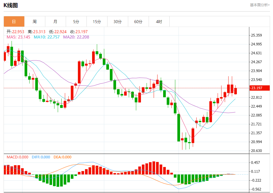 现货白银:截止北京时间20:24,现货白银下跌,现报23.191,跌幅0.63%。纽市盘前,银价停留在23.00水平上方,随机指标试图收集积极的动力,而EMA50继续为价格提供积极的支撑。
