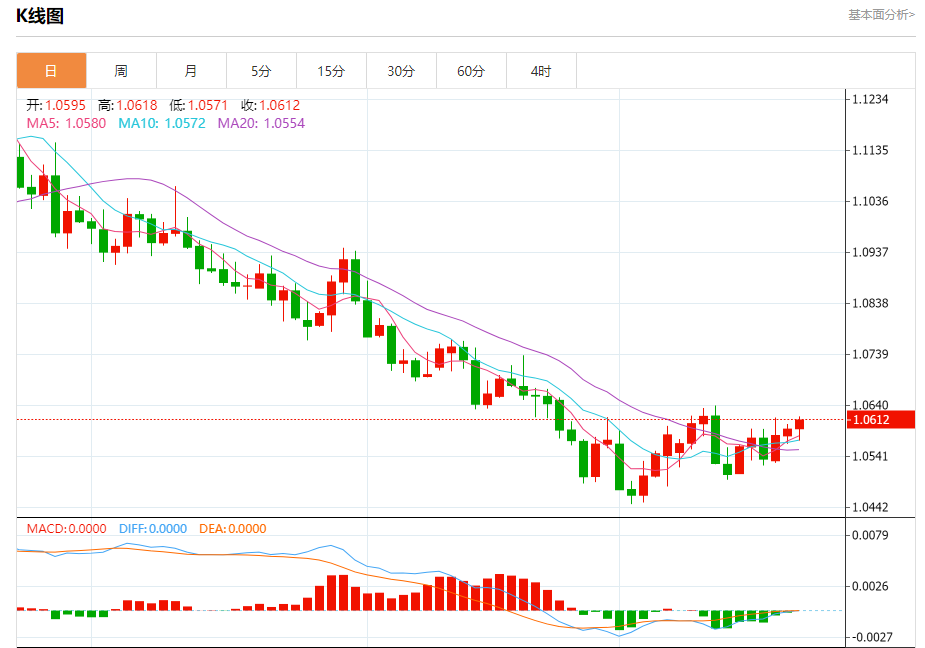 欧元/美元:截止北京时间20:24,欧元/美元上涨,现报1.0613,涨幅0.16%。纽市盘前,欧元兑美元今天早上提供了积极的交易,但它停在1.0600关口,显示出一些看跌倾向,这使我们继续保持中立,直到价格确认超过1.0550支撑和1.0640阻力所代表的趋势关键之一。