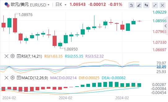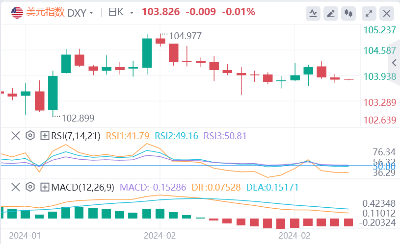 美元指数:截止发稿,美元指数交投于103.826附近。周一出现小幅下跌。市场仍然关注与即将到来的数据流相一致的潜在变化,包括将于本周晚些时候公布的 2 月份关键非农就业数据 (NFP)。美国劳动力市场继续影响美联储(Fed)的宽松周期,预计该周期将于6月开始。这表明,如果出现就业放缓,美联储可能会采取更鸽派的立场。鸽派前景本身就预示着利率下降和近期降息,可能导致美元走软。技术面上,欧元/美元周一升至1.0860,触及熟悉的技术边界,并守住了近期盘整的高位。该货币对正在1.0860和1.0800之间的横向通道中拧紧。