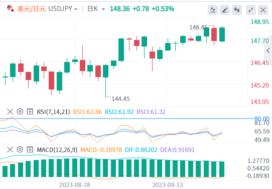 日本央行在9月会议後维持货币政策不变,将关键利率稳定在-0.1%,并将10年期日本公债殖利率目标维持在0%。在谈到政策前景时,日本央行行长植田和男在会後新闻发布会上说:"我们仍然无法确定什麽变数会导致实现2%的通膨率和结束负利率政策。他解释说,只有当实现2%的通货膨胀率指日可待时,才能考虑改变政策。日本央行会议後,美元/日元延续涨势,目前交投於2022年11月以来的最高水准148.50附近。