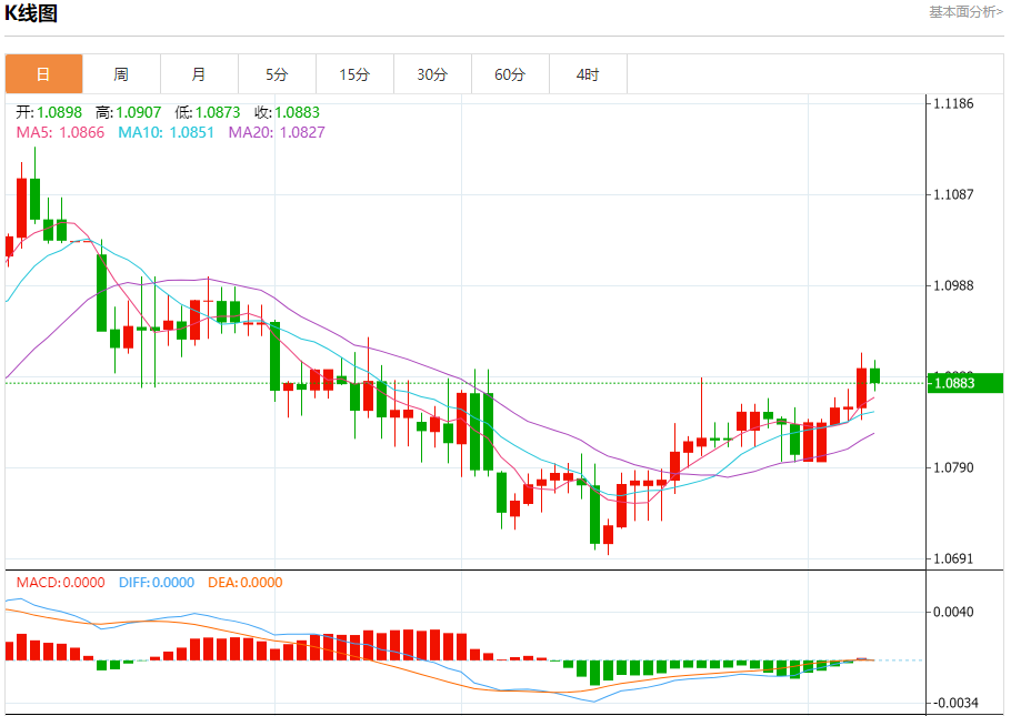 欧元/美元:截止北京时间21:27,欧元/美元下跌,现报1.0884,跌幅0.14%。纽市盘前,受随机负面因素影响,欧元兑美元汇率表现出轻微的看跌倾向,可能会重新测试1.0860处的反头肩顶形态的突破颈线,然后再次转向上涨。