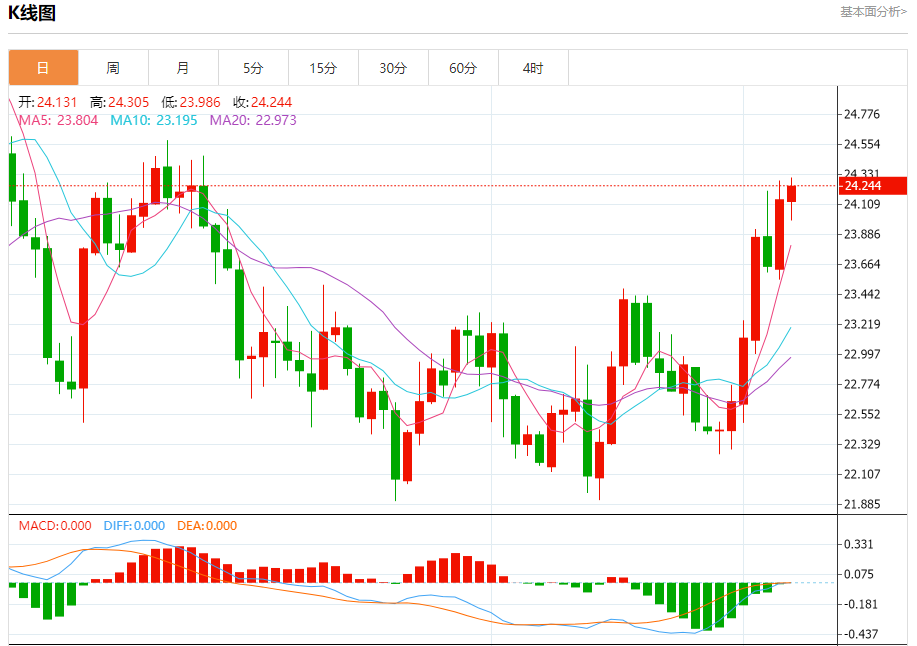 现货白银:截止北京时间21:27,现货白银上涨,现报24.247,涨幅0.41%。纽市盘前,自上午以来,白银价格在横盘轨道内波动,等待积极的动机推动价格恢复积极的交易并实现我们在24.60的主要预期目标。