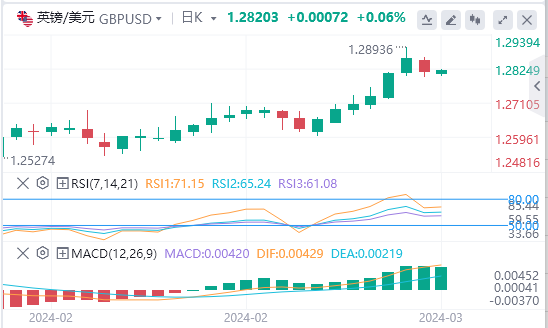 英镑:截止发稿,英镑/美元徘徊于1.28203附近。英镑/美元周一下跌,收报1.2813,涨幅0.35%。英国央行政策制定者凯瑟琳·曼恩(CatherineMann)周一表示,要使通胀压力与央行2%的目标保持一致,英国还有很长的路要走。瑞银全球研究部(UBSGlobalResearch)周一表示,预计英国央行将开始降息,8月降息25个基点(bps),而此前预期为5月降息。技术面上,汇价上行的初步阻力位于1.2855,进一步阻力位于1.2896,关键阻力位于1.2926;汇价下行的初步支撑位于1.2784,进一步支撑位于1.2754,更关键支撑位于1.2713。