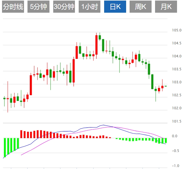 美元指数:截止发稿,美元指数走低,现报102.89。在美国劳动力市场公布2月份数据喜忧参半之后,火热的CPI数据未能引发预期的重大变化。市场仍预计美联储将从6月开始在2024年加息75个基点。美元指数技术前景看涨。尽管相对强弱指数(RSI)处于负值区域,但该指数的持续上升显示出更明显的买入势头,表明市场可能出现看涨逆转。这与移动平均收敛背离线(MACD)的红色条形线的下降相结合,表明抛售压力正在轻微下降。