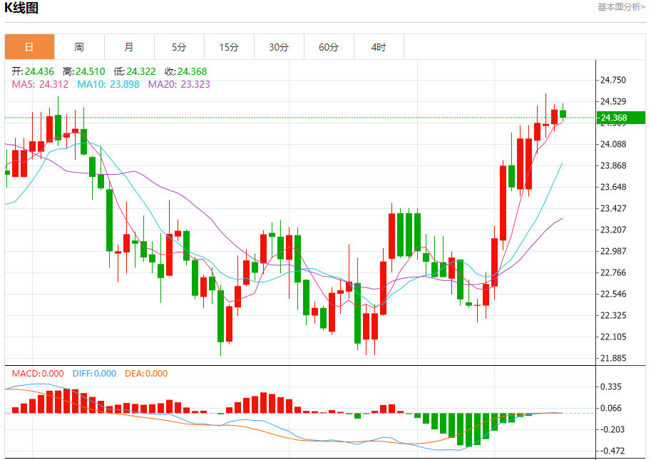现货白银:截止北京时间21:20,现货白银下跌,现报24.367,跌幅0.32%。纽市盘前,白银价格停留在看涨三角旗的阻力线上方,等待收集积极的动力,以帮助推动价格恢复今天预期的看涨趋势,其目标是从突破24.60开始反弹至25.00,然后是25.50。