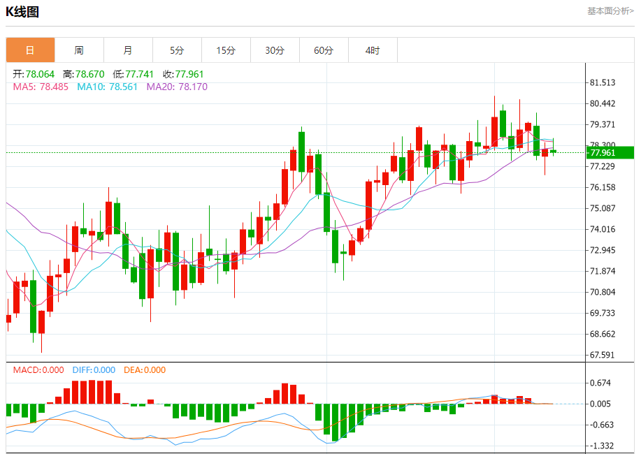 原油市场:截止北京时间21:20,美油下跌,现报77.919,跌幅0.25%。纽市盘前,原油价格测试了关键阻力78.70,但未能突破该阻力,保持在该阻力所代表的趋势关键和77.30支撑之间,这使我们的中性立场一直有效,等待确认突破其中一个水平。