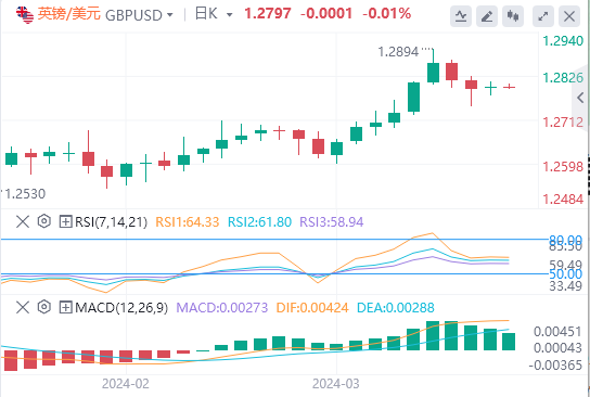 英镑:截止发稿,英镑/美元徘徊于1.2797附近。英镑/美元周三上涨,收报1.2797,涨幅0.03%。周三,英国国家统计局(ONS)的数据显示,英国1月份月度GDP预估环比增长0.2%,前值为收缩0.1%。然而,数据改善未能提振英镑,因为投资者认为英国经济可能会结束2023年下半年的衰退。与此同时,1月份工业生产指数从12月份的0.6%环比增长下降0.2%。技术面上,汇价上行的初步阻力位于1.2814,进一步阻力位于1.2830,关键阻力位于1.2850;汇价下行的初步支撑位于1.2778,进一步支撑位于1.2758,更关键支撑位于1.2742。