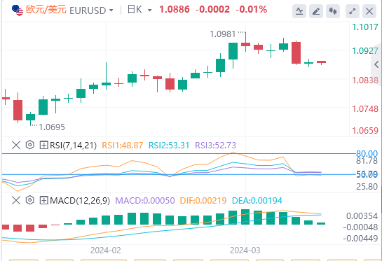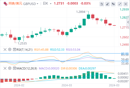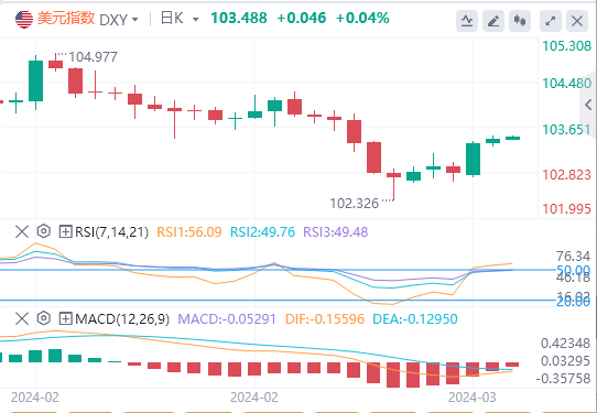 美元指数:截止发稿,美元指数交投于103.448附近。尽管美国通胀仍然具有粘性,但对美联储宽松周期开始的预期仍然稳定。市场对降息将于6月开始的预期不以为然,但现在的焦点将放在即将到来的3月会议上修订后的点阵图上,以收集有关美联储立场的更多证据。技术面上,日线图显示,200日均线103.69附近即将构筑阻力区。一旦突破该区域,美元指数可能会试图上涨至2024年高位104.97(2月14日)。从该水平进一步上涨后,周线高位106.00(11月10日)和11月高位107.11都将成为目标。