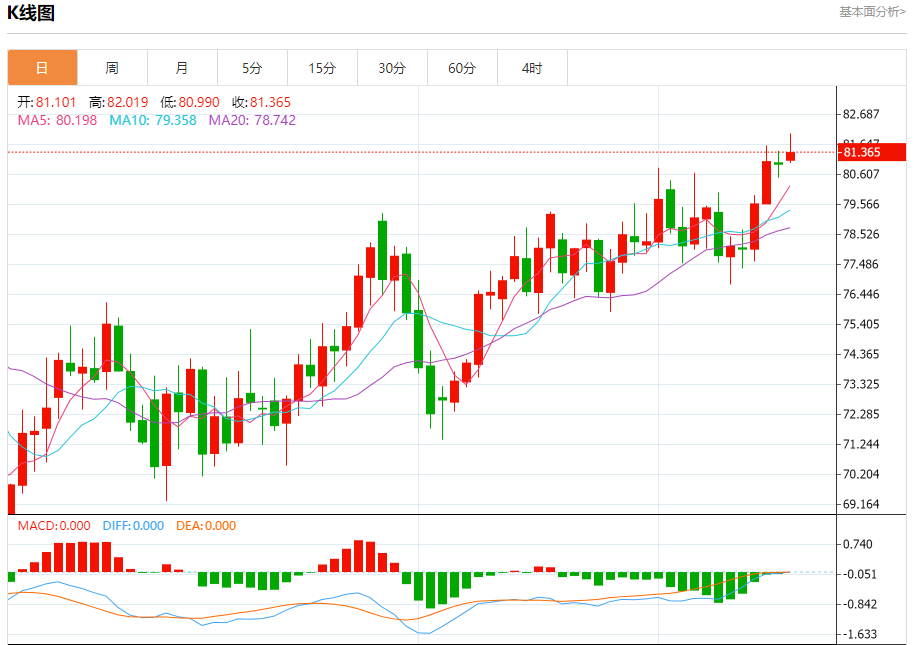 原油市场:截止北京时间21:27,美油上涨,现报81.385,涨幅0.52%。纽市盘前,原油价格持续上涨触及82.00美元关口,强化了在图表上显示的看涨通道内继续看涨趋势的预期,等待访问代表我们下一个目标的82.60,提醒您突破82.60将延长看涨波至83.85。