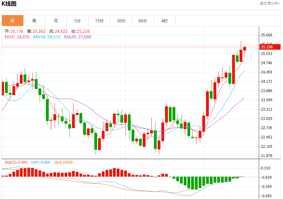 现货白银:截止北京时间21:27,现货白银上涨,现报25.260,涨幅0.43%。纽市盘前,白银价格显示出平静的看涨倾向,试图恢复今天的预期看涨趋势,由随机到达超卖区域提供支持,等待更多的上涨以实现我们从25.50开始并延伸到26.07的目标。