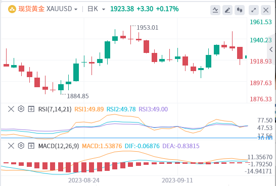 周五亚盘,黄金交投于1923.38附近。美联储周三表示在今年晚些时候可能再加息一次,这推动了美元和美债收益率的冲高,其影响已在全球市场中显现。除了对美国股指期货产生压力外,也推动了黄金价格在周四急剧下跌,并再度失守200日均线关键位置。
