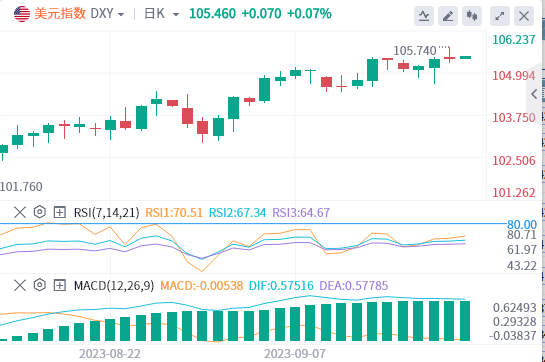 9月22日北京时间周五亚市早盘,美元指数徘徊在105.46附近。周四,美元指数小幅回落,但盘中仍一度接近105.74的六个月高位,而后回吐全部涨幅并转跌,最终收跌0.06%,报105.38。美债收益率方面,两年期美债收益率先涨后跌,开盘一度冲上5.2%关口上方,而后震荡回落,最终收报5.144%;10年期美债收益率大幅上行,并一度逼近4.5%关口,最终收报4.494%。受美债收益率“压制”,现货黄金一度跌破1920美元关口,并在美盘前跌至1913.97美元的日内低点,最终险守1920美元关口,收跌0.53%,收得日线三连阴,报1920.08美元/盎司。现货白银呈V型走势,其在美盘前一度跌至22.81美元的日内低点,而后收复全部失地并转涨,最终收涨0.7%,报23.4美元/盎司。原油震荡上行,WTI原油在欧盘时段一度跌至88.34美元的日内低点,而后重回90美元关口上方,但未能站稳此处,最终收涨0.38%,报89.53美元/桶;布伦特原油收涨0.04%,报93.19美元/桶。