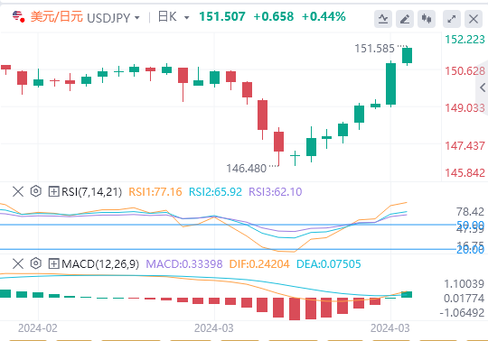 在日本央行宣布货币政策后,美元/日元大幅上涨,周二上涨超过1%。该货币对在周三早盘保持看涨势头,最后一次交投于11月以来的最高水平151.50。