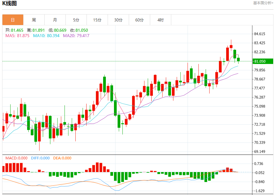 原油市场:截止北京时间21:24,美油下跌,现报81.031,跌幅0.48%。纽市盘前,原油价格在看涨通道的支撑线附近波动,EMA50满足这一支撑以增加其强度,从而使看涨趋势在即将到来的时期保持活跃,目标是83.85美元,然后是86.00美元水平作为下一个主要站。