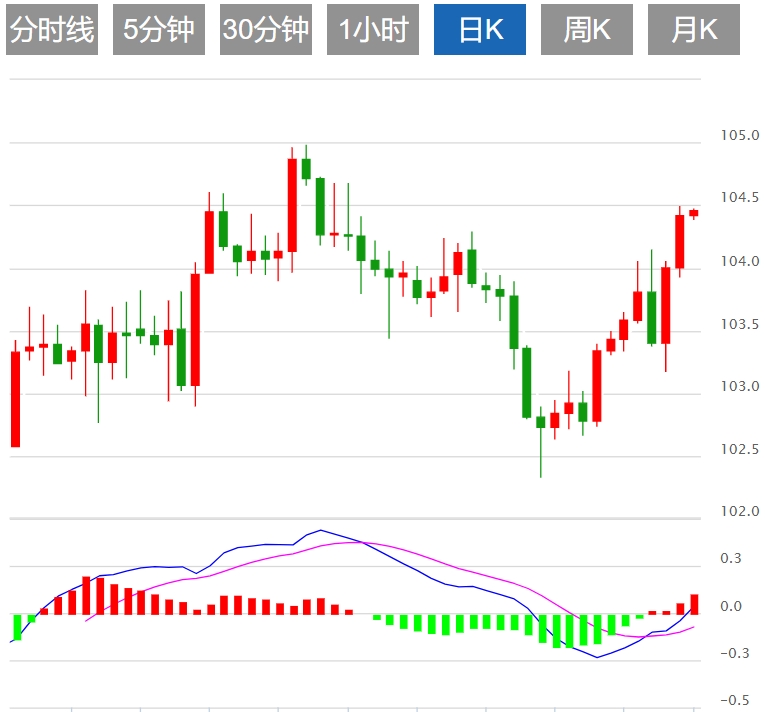 美元指数:截止发稿,美元指数走高,现报104.45。美元指数(DXY)目前交投于强劲的104.45,为2月中旬以来的最高水平。值得注意的是,正在进行的数据继续为美联储(Fed)宽松周期的开始设定预期,大多数人认为该周期将于6月开始。美联储拒绝了更高的通胀结果,主席杰罗姆·鲍威尔(Jerome Powell)向市场保证,该行不会对连续两个月的通胀数据做出仓促反应。此外,2024年的利率预测没有改变。日线图上的指标反映了看涨势头。相对强弱指数(RSI)处于正斜率,位于正值区域。这幅插图表明买家的持续实力,暗示短期内有可能进一步升值。同时,移动平均收敛散度 (MACD) 显示上升的绿色条。这种日益增加的看涨背离表明,上升势头正在增强,看涨推动的可能性正在上升。