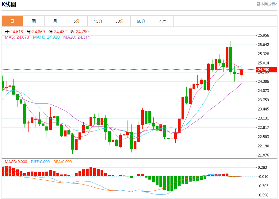现货白银:截止北京时间20:25,现货白银上涨,现报24.777,涨幅0.49%。纽市盘前,白银价格再次尝试突破24.60美元水平,但直到现在仍保持稳定,以保持今天的看涨趋势。这是由接近超卖区的随机指标支撑的,等待突破24.85美元以轻松实现我们在25.50美元的第一个预期目标。