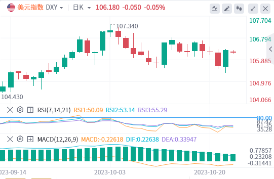 美元指数:截止发稿,美元指数下跌,现报106.18,跌幅0.05%。欧市盘前,标普全球制造业采购经理人指数升幅高于预期。美元指数昨日跌破106,但再度反弹至106上方。10月标普全球综合采购经理人指数(PMI)出现增长,从50.2升至51.0。其中,服务业采购经理人指数上升至 50.9,制造业采购经理人指数上升至 50.0。过去六个月中,制造业指数一直保持在 50 点荣枯线上方,表明制造业出现了积极转变。